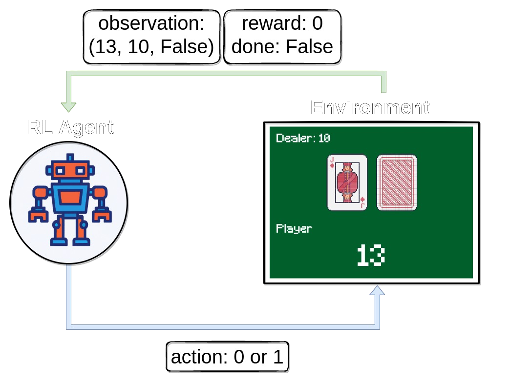 next_state、reward、terminated 和 truncated 變數不言自明,但 info 變數需要一些額外的解釋。此變數包含一個字典,其中可能包含有關環境的一些額外資訊,但在 Blackjack-v1 環境中您可以忽略它。例如,在雅達利環境中,info 字典有一個 ale.lives 鍵,它告訴我們智慧體還剩下多少條生命。如果智慧體生命為0,則該回合結束。